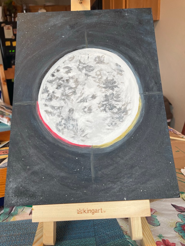 I pick up random crafts here and there. I experimented with painting despite my apprehension over the thought of wasting my time and money on supplies. I was pleasantly surprised that it provided zen like qualities which melted my worries. Time appeared to be distorted where I didn’t realize hours had gone by. I was inspired by the moon that looked like a medicine wheel in the cold predawn sky near Wind Cave National Park in 2021. It took me 6 months to have the confidence to sit down and paint my vision.